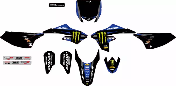 - Incluye adhesivos para cubre-radiadores, depósito, panel portanúmero, caja filtro de aire, protectores inferiores de horquillas, guardabarros delantero, guardabarros trasero y basculante
