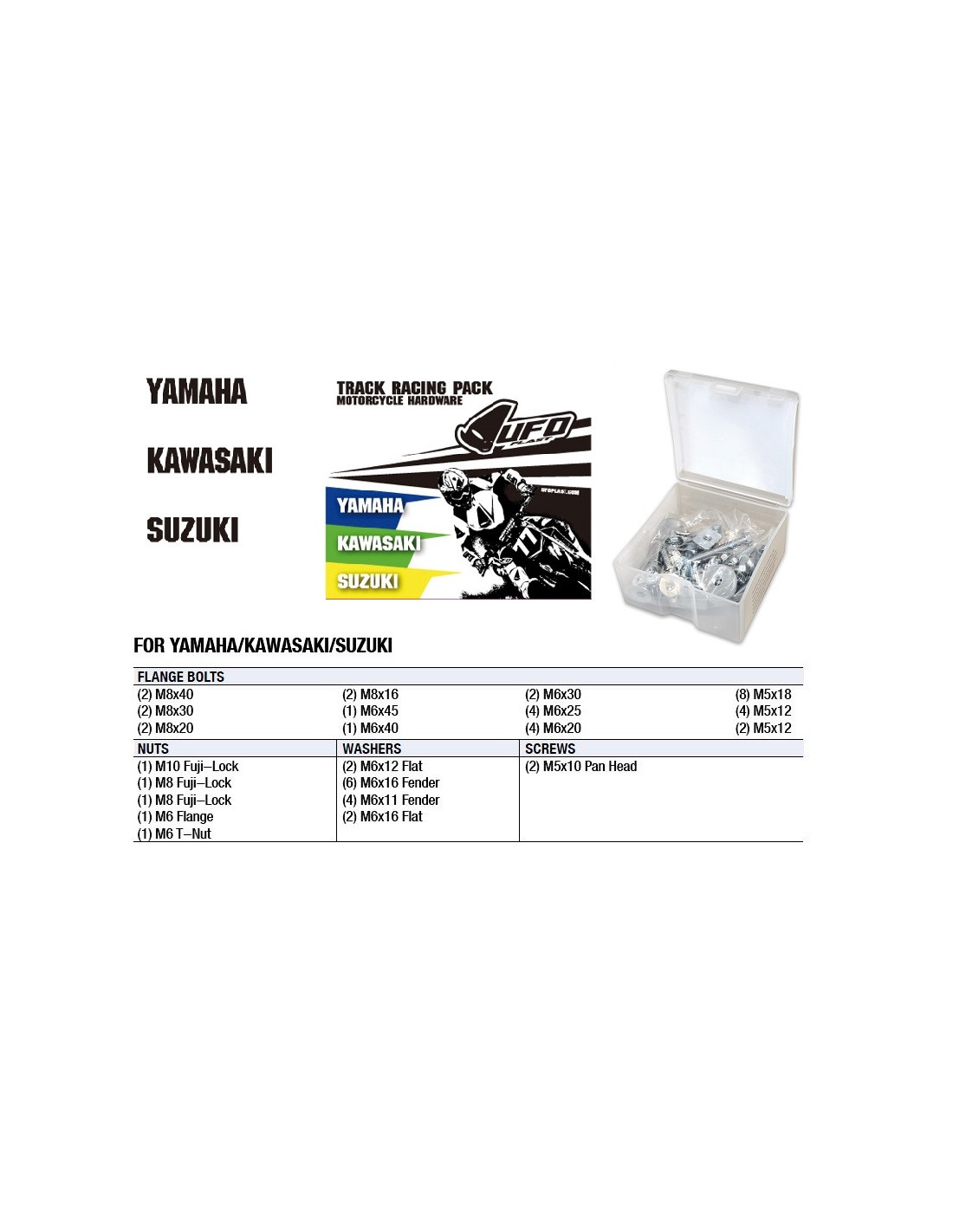 Track Racing Pack Hardware Sets Honda Contains an assortment of commonly used bolts, screws, washers and clips that can save your track daybrbr SET CONTAINS: (6) M6x16 bolts (2) M6x20 bolts (2) M6x25 bolts (2) M6x30 bolts (1) M6x45 bolts (1) M8x20 bolts (1) M8x25 bolts (4) M6x12 Shroud bolts (4) M6x11 Fork Guard bolts (2) M8x16 Seat bolts (2) M8x22 Seat bolts (1) M10x 24 Subframe bolts (2) M6x12 large flange bolts (2) M8x16 large flange bolts (1) M6 Fuji nuts (1) M3 Fuji nuts (1) M10 Flange nuts (4) M6x10 screws (4) M6x16 washers (2) M6x22 washers (2) M6x25 washers (1) M8x25 washers