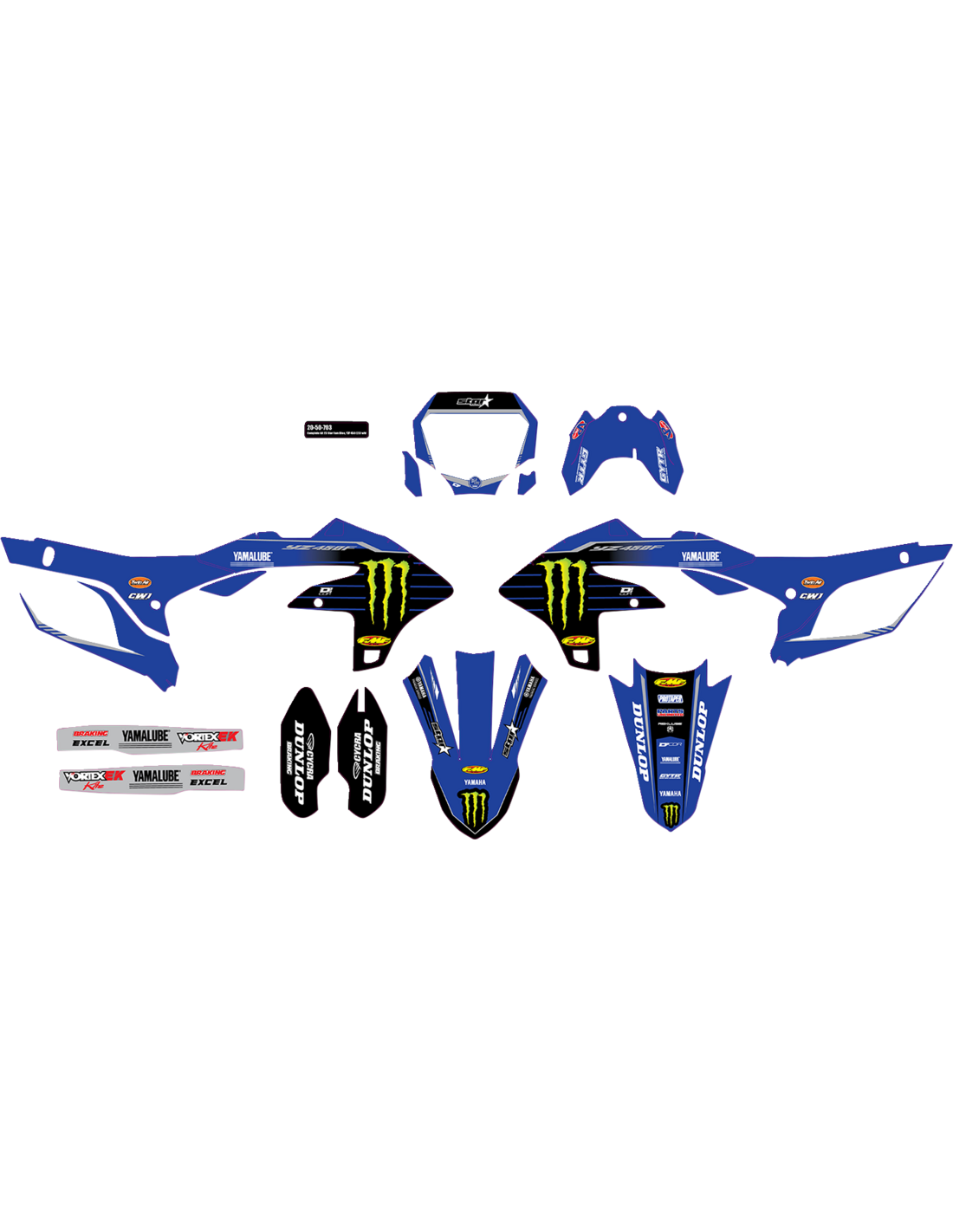 - Incluye adhesivos para cubre-radiadores, depósito, panel portanúmero, caja filtro de aire, protectores inferiores de horquillas, guardabarros delantero, guardabarros trasero y basculante