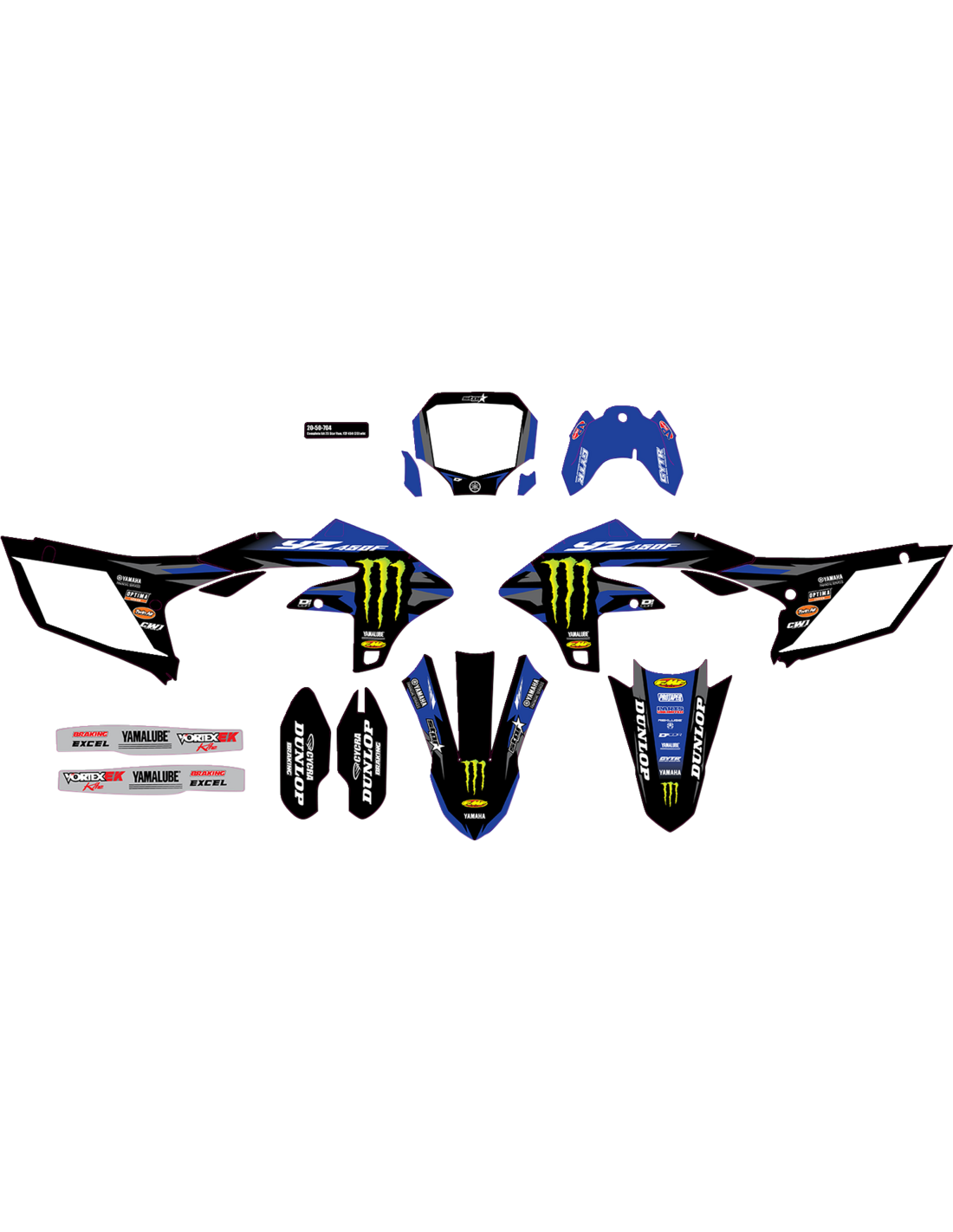 - Incluye adhesivos para cubre-radiadores, depósito, panel portanúmero, caja filtro de aire, protectores inferiores de horquillas, guardabarros delantero, guardabarros trasero y basculante