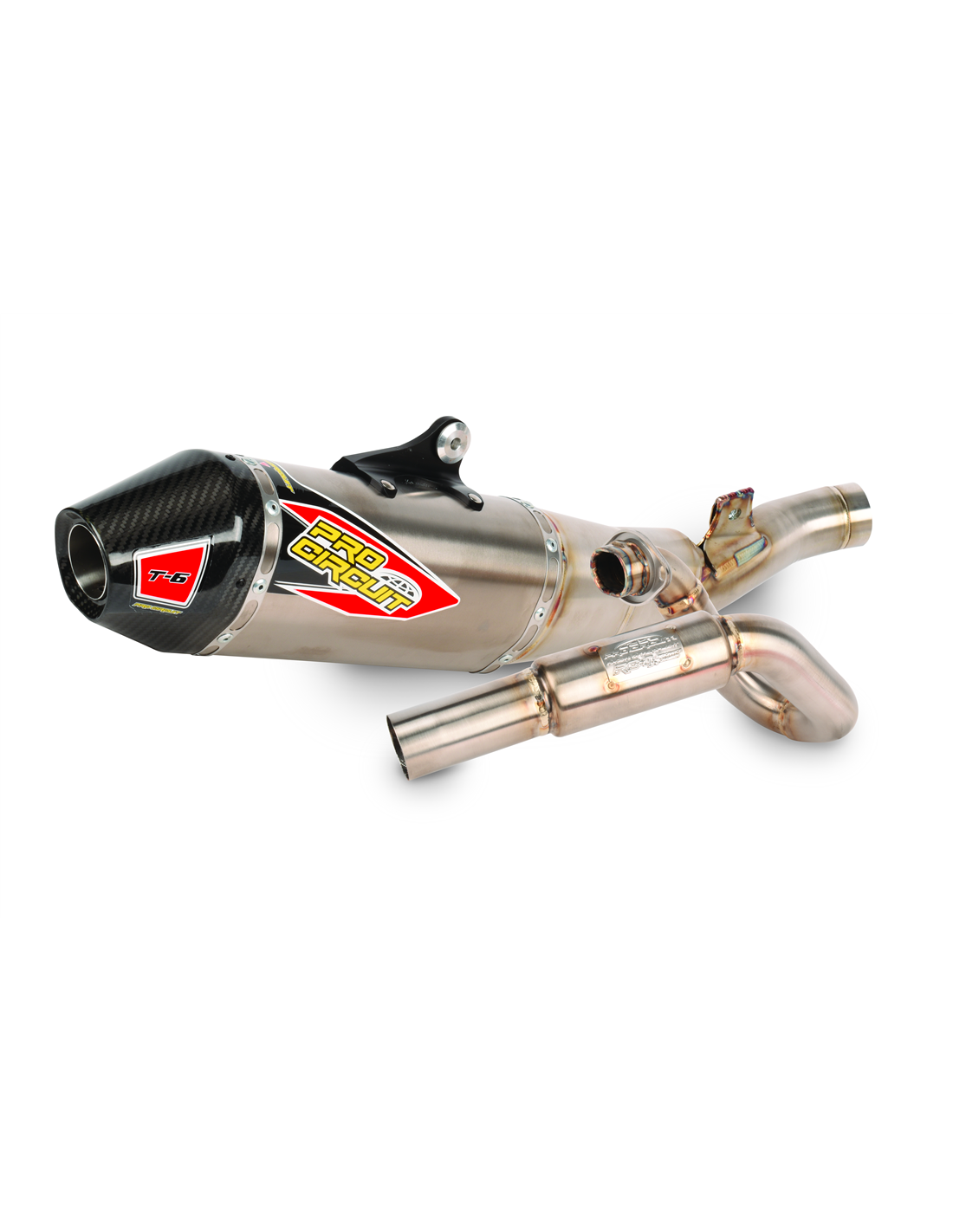- T-6 stainless steel exhaust system offers the same benefits as Ti-6 titanium exhaust system, but the T-6 is constructed of stainless steel and aluminum for increased strength and durability while giving riders a more affordable alternative to titanium; comes with a removable spark arrestor making it easy to alternate between off-road and closed course riding