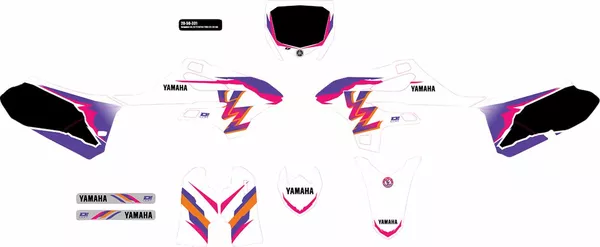 - Incluye adhesivos para cubre-radiadores, depósito, panel portanúmero, caja filtro de aire, protectores inferiores de horquillas, guardabarros delantero, guardabarros trasero y basculante