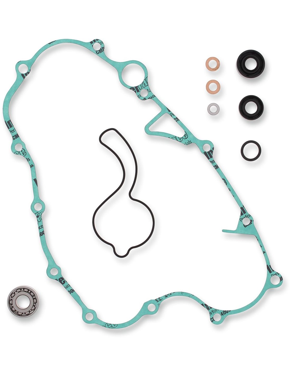 - Un kit normal incluye: rodamientos, si procede; juntas de goma; retén de bomba de agua, si procede; junta de tapa motor, junta de bomba de agua, circlips del eje de bomba de agua y arandelas de cobre de tornillo de purga
