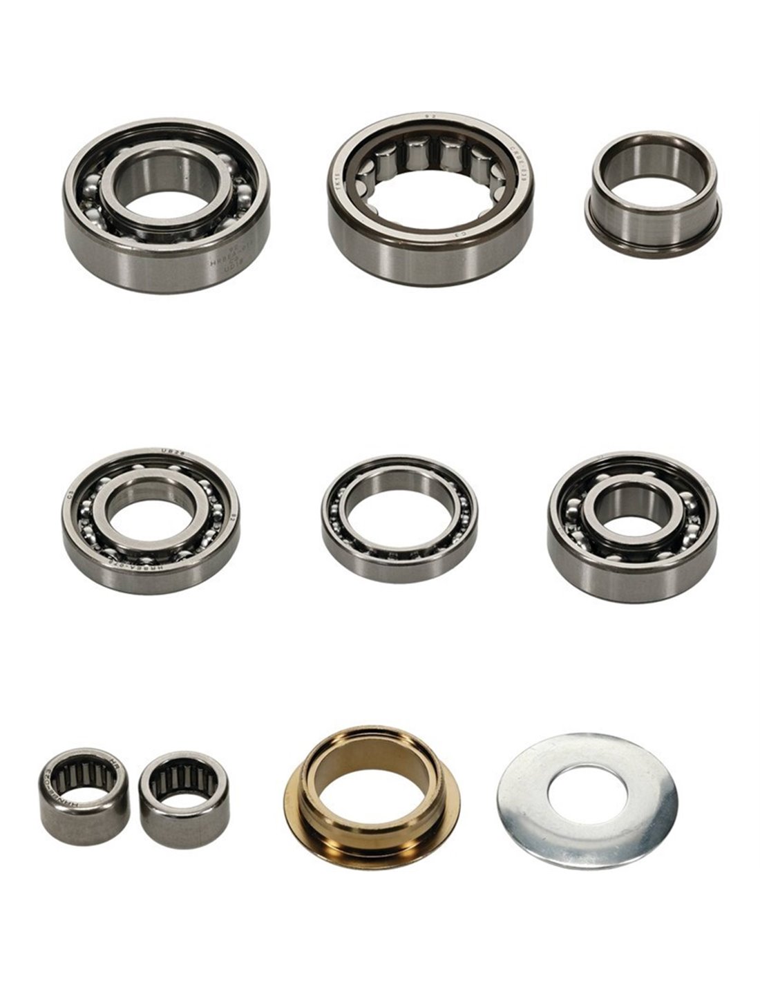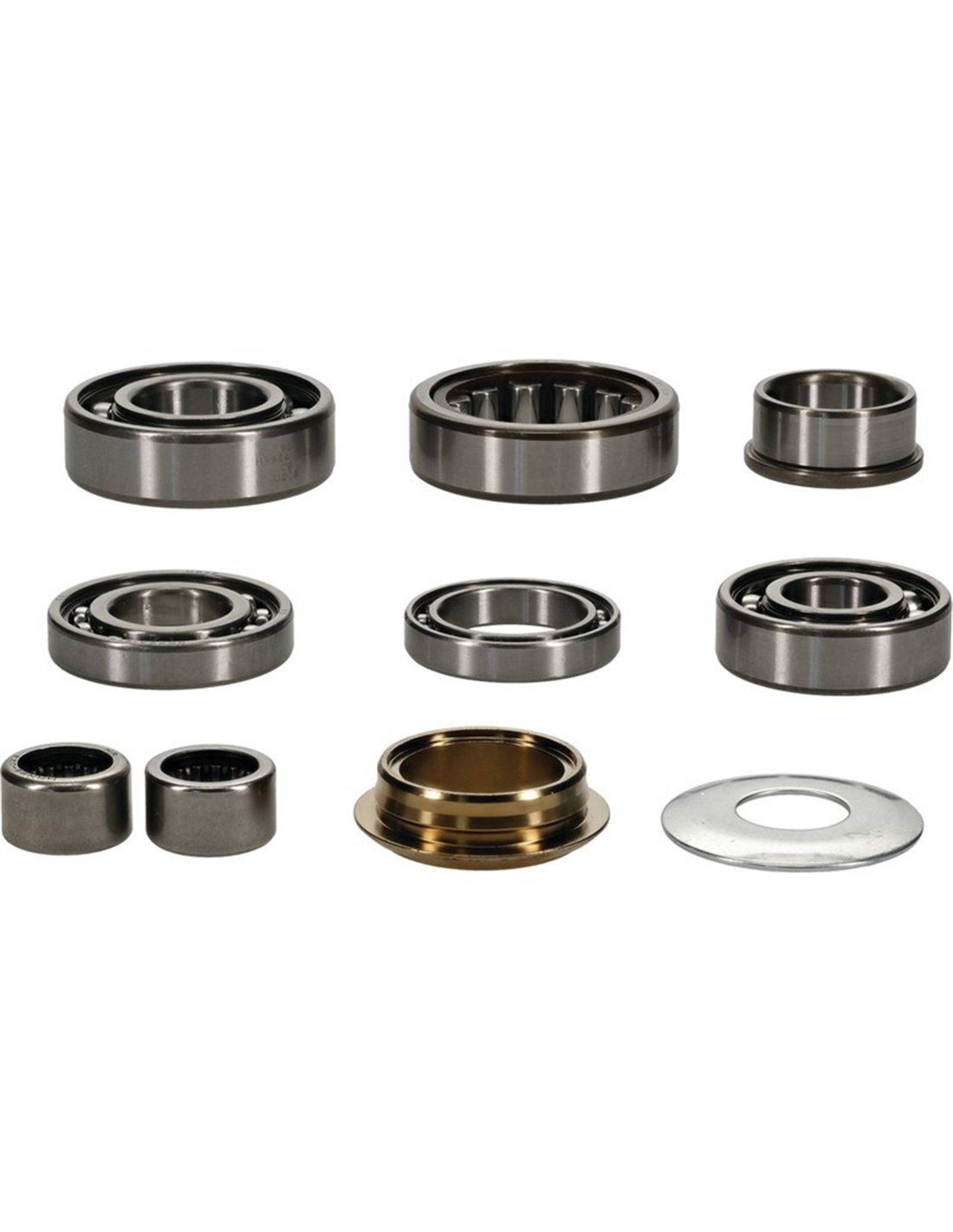 Incluye: Rodamientos del eje primario, rodamientos del eje secundario, rodamientos del eje de cambio, rodamientos del tambor de cambio, casquillo del eje de salida y arandela.