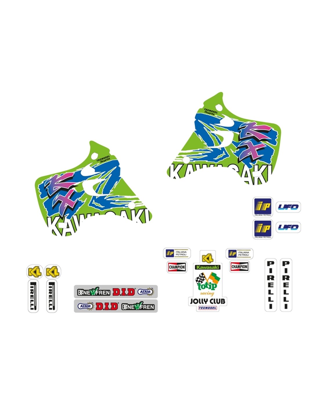 The sticker kit includes: tank pair, radiator shrouds pair, airbox pair, number plates, fork protections pair, swing arm pair, front fender and rear fender.