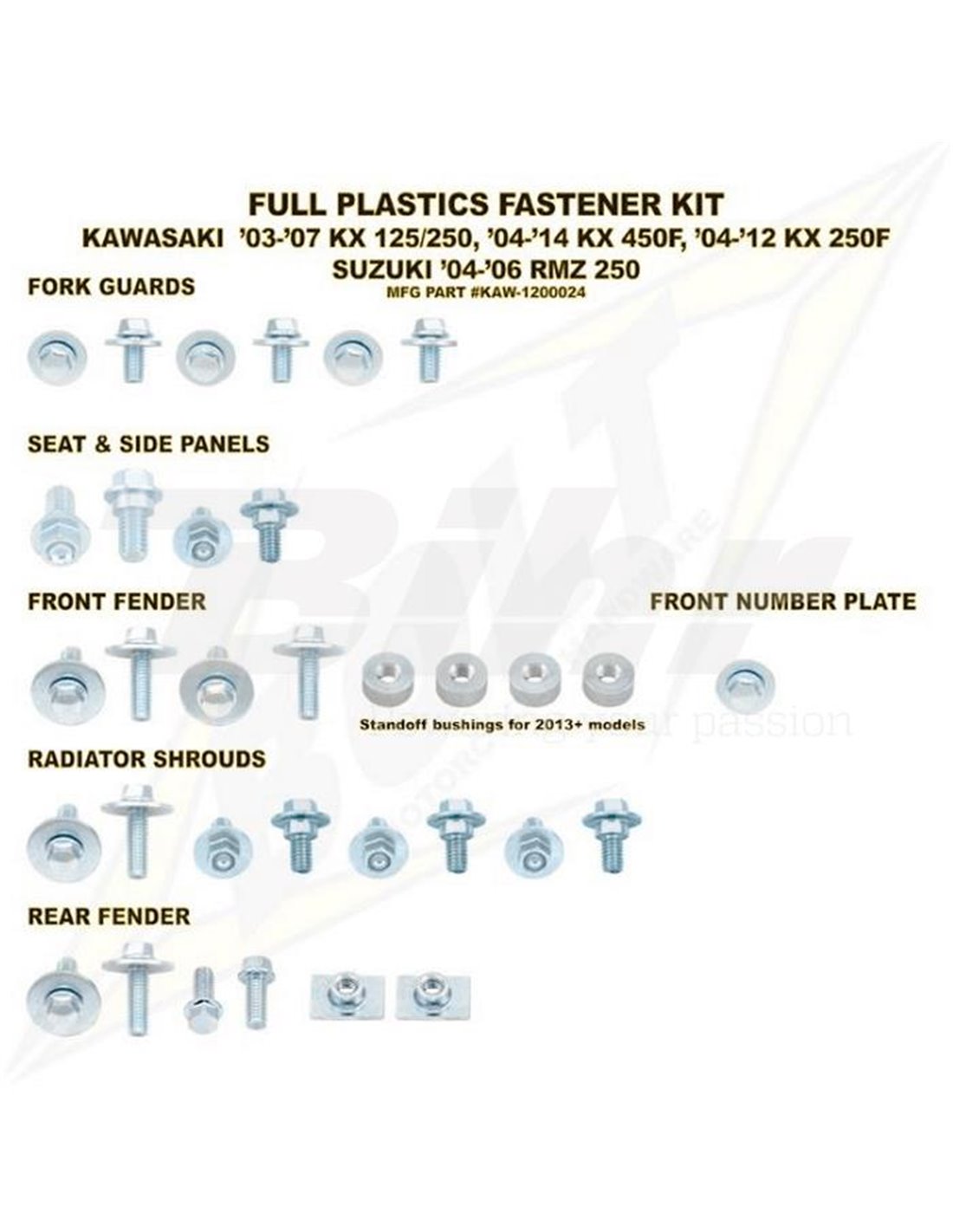(marque, modèle, année)Kit de visserie plastique KAWA 13 KX250F / 12-13 KX450F