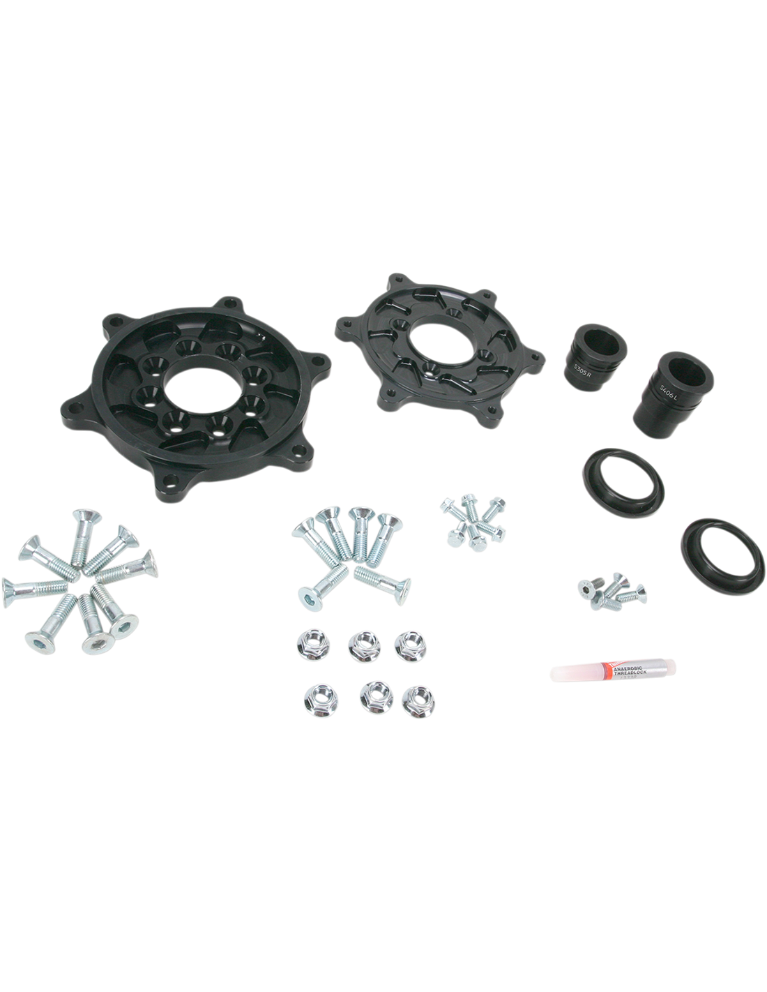 - Los delanteros incluyen el adaptador de soporte con todos los espaciadores y el herraje necesario para montar el disco de freno OEM; los traseros incluyen los adaptadores (2) y todos los espaciadores y el herraje necesario para montar el disco de freno y la corona OEM