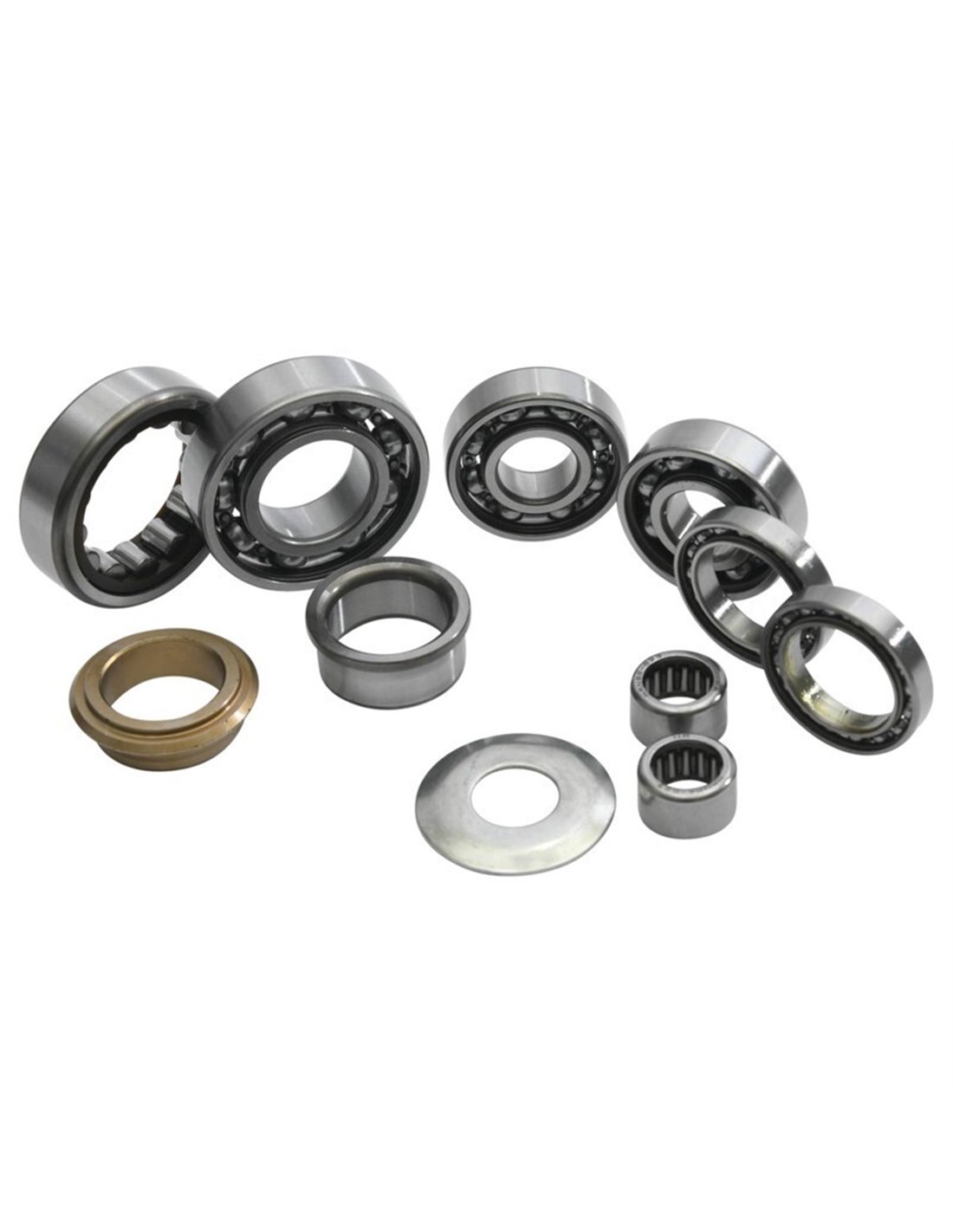 Incluye: Rodamientos del eje primario, rodamientos del eje secundario, rodamientos del eje de cambio, rodamientos del tambor de cambio, casquillo del eje de salida y arandela.