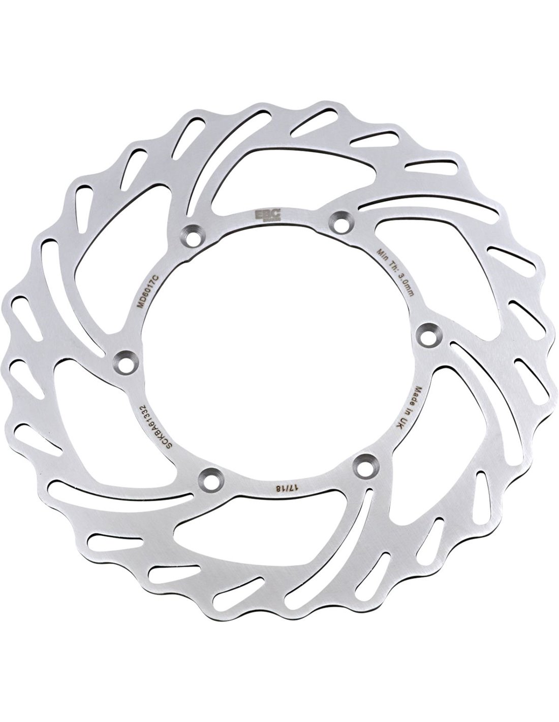 Disco de freio de perfil Contour marcante. Aço inoxidável tratado termicamente. O design do disco reduz a massa não amortecida. Feito de aço laminado alemão tratado termicamente.. Sem orifícios de ventilação na área de contato da almofada para melhorar o desgaste da almofada e do disco para uso em enduro.