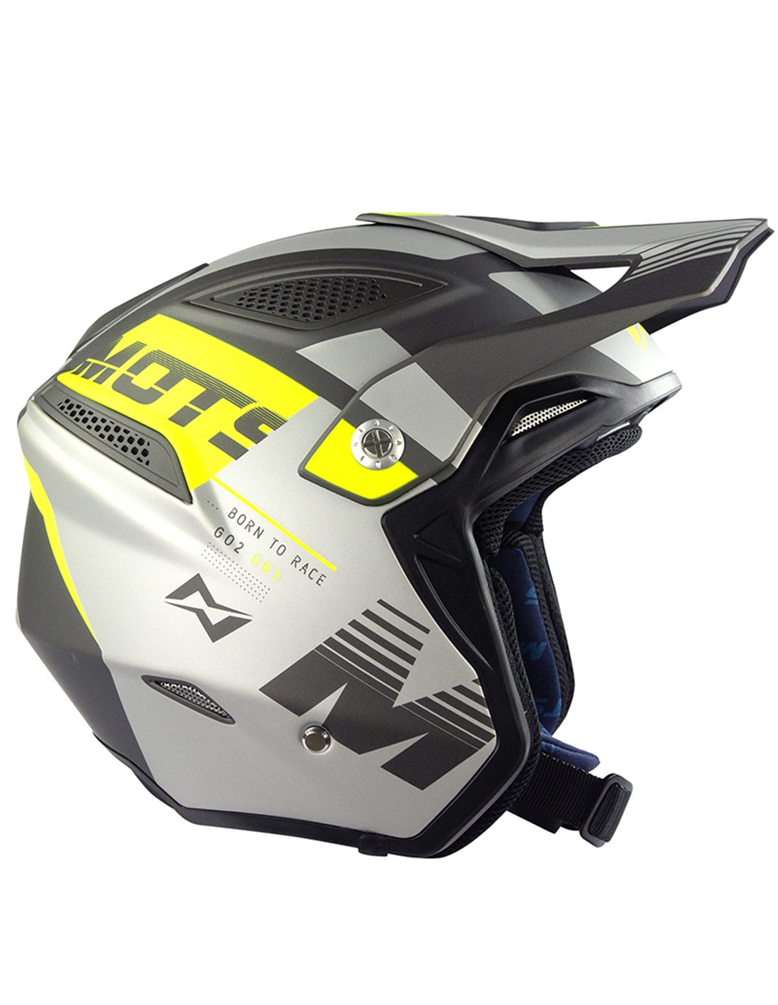 Casco MOTS GO2 Fluor M Fabricado en fibra de vidrio laminada con “bag-molding”. Dos tamaños de calota externa. Casco ventilado con entradas frontal, lateral y trasera. Interior de Coolmax para mayor absorción del sudor. Interior desmontable y lavable. Tornillos de aluminio. Cierre con hebilla micrométrica. Visera regulable y desmontable. Peso: +-900gr. Homologación ECE 22.0