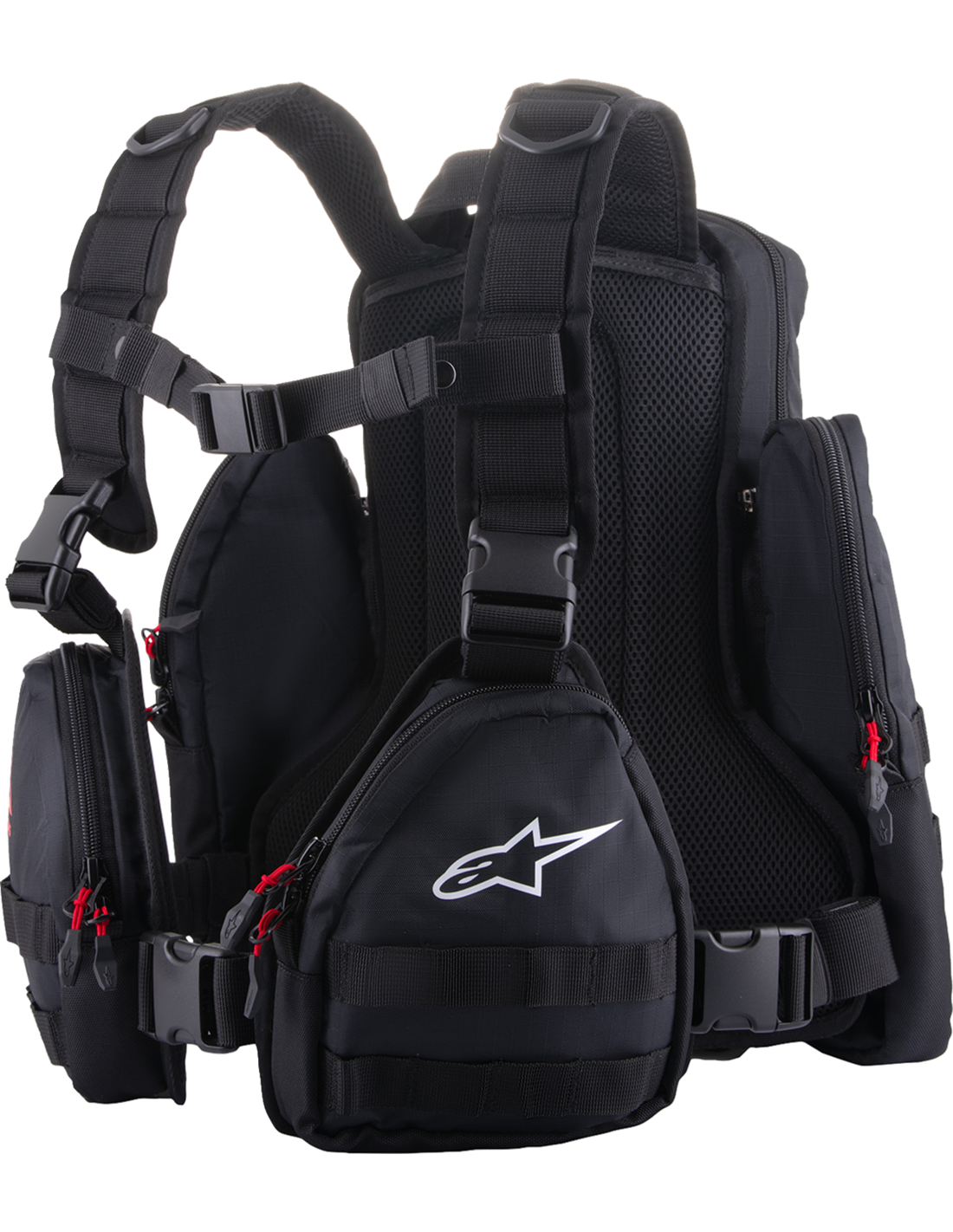 - Ergonomic shoulder straps with perforated foam padding and mesh panels for an optimized airflow, adjustable and removable chest strap and the Alpinestars’ magnetic chest buckle for a fast and secure adjustment.