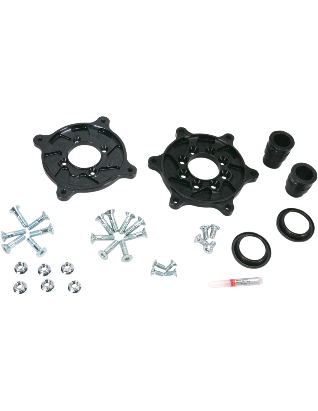 - Los delanteros incluyen el adaptador de soporte con todos los espaciadores y el herraje necesario para montar el disco de freno OEM; los traseros incluyen los adaptadores (2) y todos los espaciadores y el herraje necesario para montar el disco de freno y la corona OEM