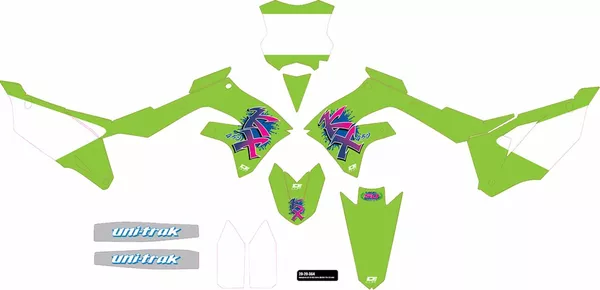 - Incluye adhesivos para cubre-radiadores, depósito, panel portanúmero, caja filtro de aire, protectores inferiores de horquillas, guardabarros delantero, guardabarros trasero y basculante